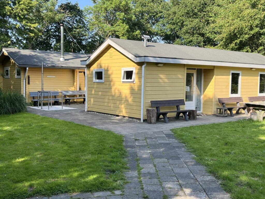 Ook hebben wij een prachtig ingerichte hut (van 5 bij 6 meter) met een overdekte waranda, waar een tafel met 4 stoelen staan.